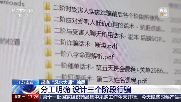 南京市公安局秦淮分局刑侦大队副大队长姚翔:年龄集中在50岁到65岁之间,并且以女性居多,这些人大部分已经退休了,子女也慢慢长大有自己的家庭了,所以这些人对于自己的家庭,特别是子女的身心健康、安全,是非常在意的。 售卖化妆品的传媒公司转型推广风水课 警方迅速对相关案情开展研判,循线追踪到一家注册地在南京的传媒公司。这家公司2024年初还在直播卖化妆品,之后突然转型推广线上的所谓风水课程。 南京市公安局秦淮分局刑侦大队副大队长姚翔:当时这个公司运营也不是特别好,入不敷出,所以到了2024年11月份的时候,公司就安排人员到外地进行学习,分了好几批次学习,学完回来之后,整个公司开始上线“二阶”团队,就是所谓的诈骗。 分工明确设计三个阶段行骗