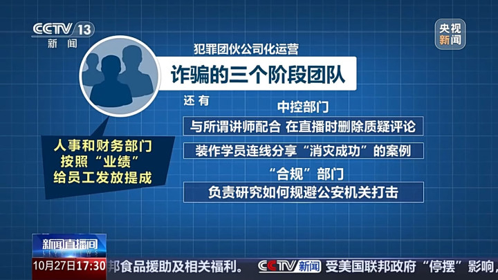 警方发现,犯罪团伙公司化运营,不仅有诈骗的三个阶段团队,还有中控部门与所谓讲师配合,在直播时删除质疑评论,或装作学员连线分享“消灾成功”的案例。“合规”部门负责研究如何规避公安机关打击,人事和财务部门则按照“业绩”给员工发放提成。 南京市公安局秦淮分局刑侦大队副大队长姚翔:“二阶”的收入是最高的,一个普通员工一个月大概能拿到2万多块钱,组长一个月甚至在5万块钱以上。后勤人事部门会对“二阶”团队进行KPI考核,转化率要达到50%以上,“一阶”团队筛选了潜在客户之后,比如10个人,“二阶”团队至少要对10个人当中的5人实施成功诈骗,这是公司对他们的要求。 南京市公安局秦淮分局刑侦大队副大队长李旭:我们抓到很多嫌疑人的时候我们也问他,有些员工讲得比较直白,说我从来不信这个,对于一些受害人提问到一些关于名字、家庭风水的问题的时候,其实他们也是利用一些AI的软件,利用里面的答案来对受害人进行回答。 受害人遍布18个省份超1400人 “花钱消灾”是假,“坑蒙拐骗”是真。目前,警方抓获的92名犯罪嫌疑人中,88人已被依法采取刑事强制措施,初步查明该团伙涉案资金达4600余万元,受害群众遍布18个省份共1400余人。 (总台央视记者陈昱汤涛罗飞) |